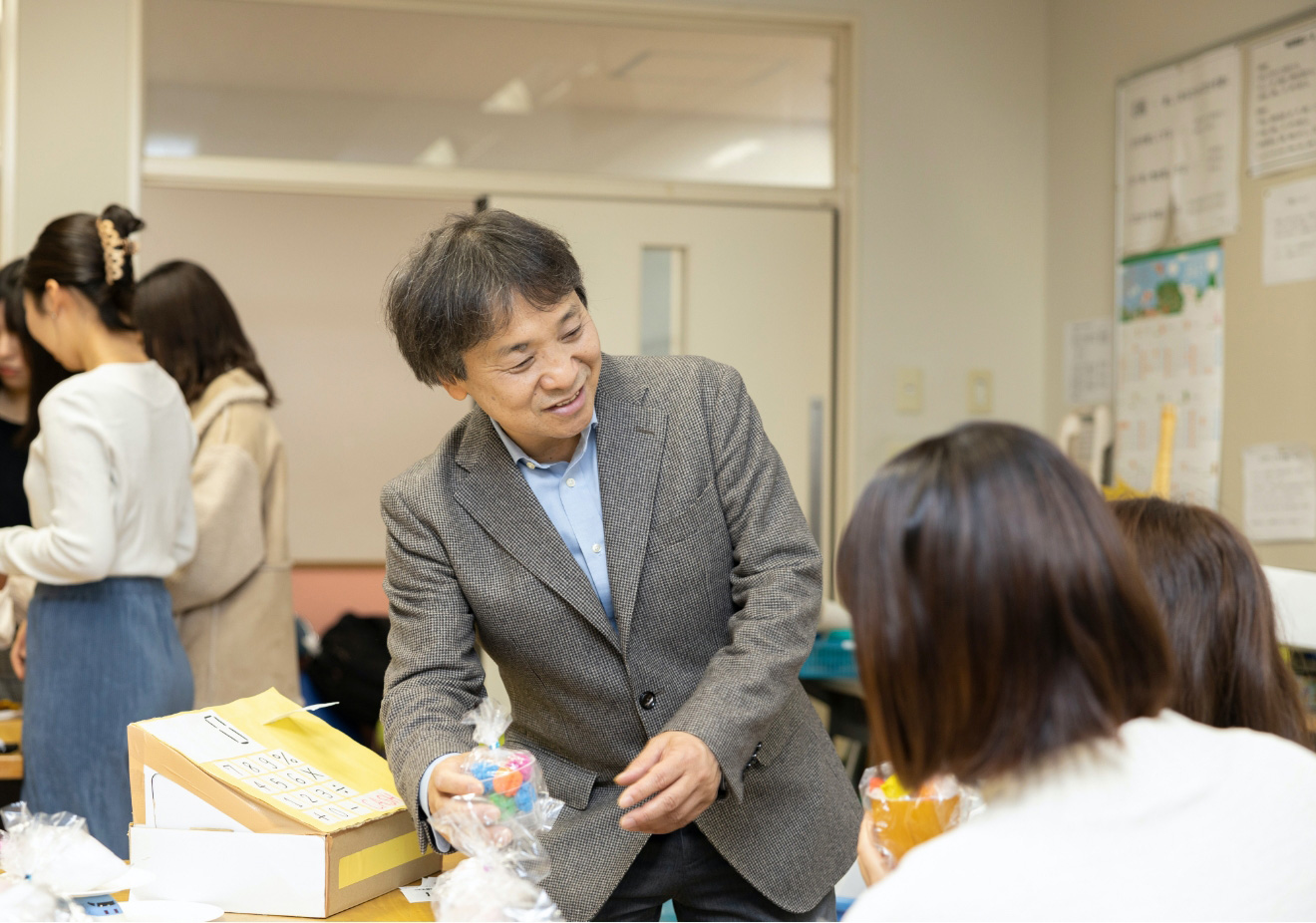 保育の5領域「健康・人間関係・環境・言葉・表現」のうち、美術分野の「表現」を担当しています。保育の現場では子どもたちが主役。そのため授業では、学生自身の自己表現が目的ではなく、子どもの感受性を豊かにし創造性を育むための技術を身につけてもらいます。具体的には、まず子どもの発達段階を理解した上で、身の回りにある紙コップや落ち葉などを使って季節や行事にあった工作をつくったり、絵本や紙芝居を選んで読み聞かせの練習するなど、表現のいろいろを実践的に学びます。希望があれば、絵本や紙芝居の制作も行います。今は保育者でもデジタルに強い人材が求められますので、動画制作やYouTube発表も取り入れています。
